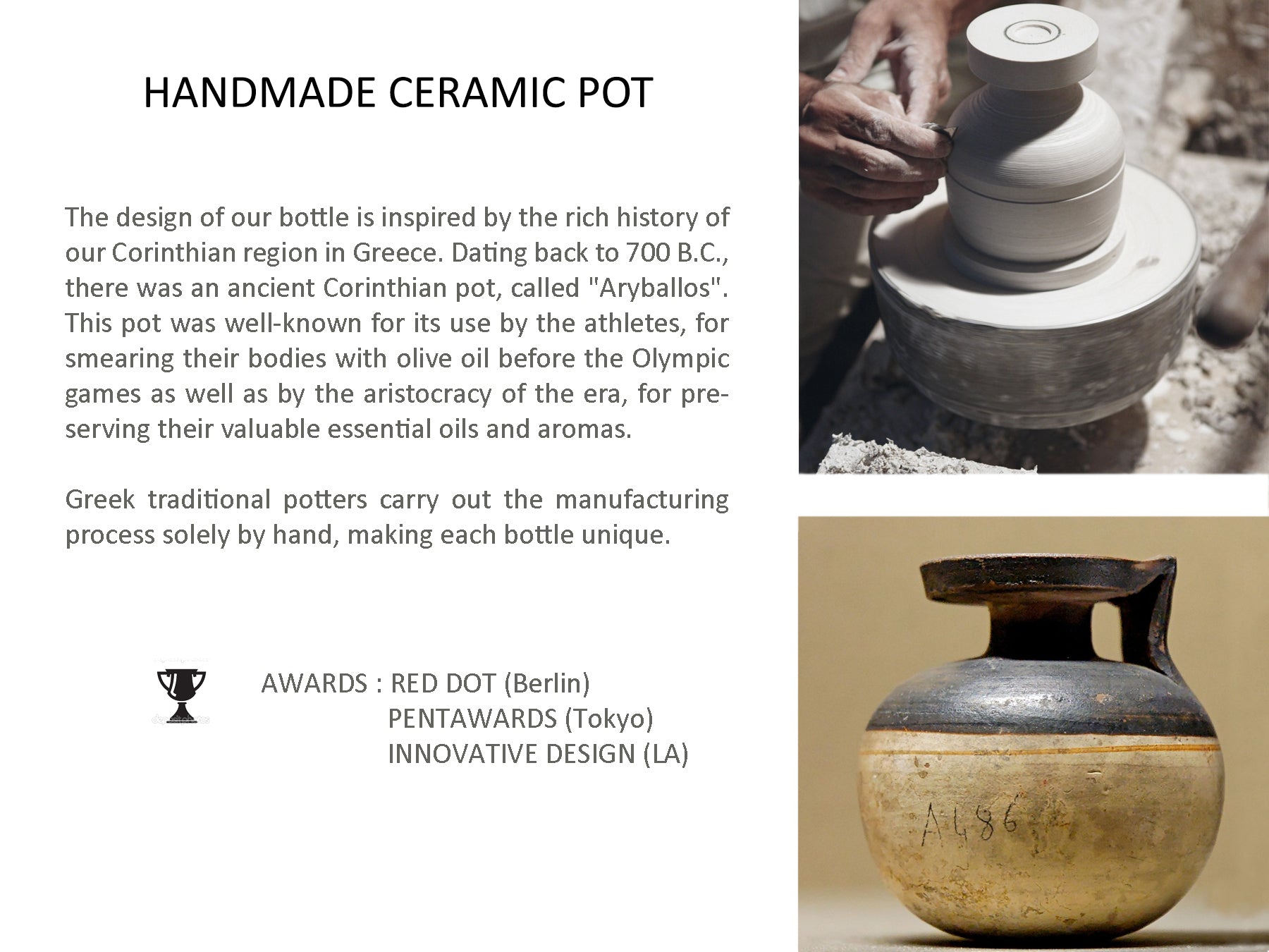 Ladolea Organic Extra Virgin Olive Oil is cold pressed under 27°C, unfiltered. Bottled in a handmade ceramic pot inspired by the rich history of the Corinthian region in Greece. The opaque surface prevents light penetration, thus maintaining the olive oil in its purest form and preserving the precious LADOLEA aroma and taste. Each reusable ceramic pot is accompanied by a cork-pourer so that it can be refilled and reused.
